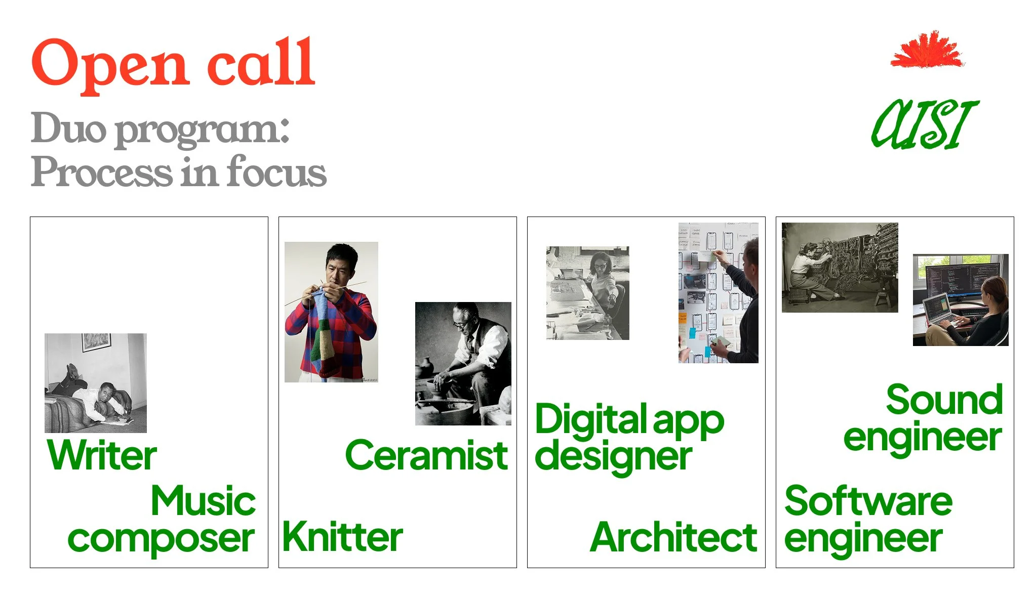 This program connects two participants from creative disciplines that share non-obvious similarities in their creative processes. It offers them the opportunity to explore their own practices while engaging with and learning from another creative professional. Through collaboration and reflection, guided by the program curator, participants will gain valuable insights into both their own work and their partner’s methodologies.